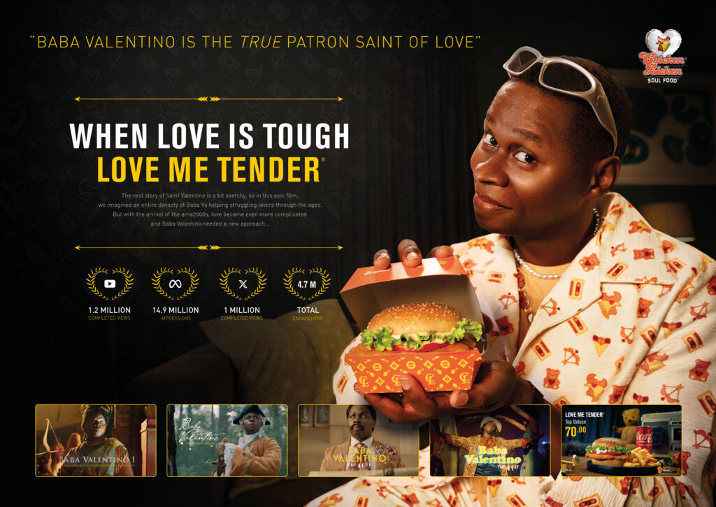 February 2024 saw the story of Baba Valentino come to life. This film for Chicken Licken features the fictional character of Baba Valentino through the generations, solving loves’ most difficult problems. But when modern love gets really tough, Baba turns to the new icon of love, a Love Me Tender® burger. Navigating the potholes of love’s rocky road has never been simple. Playing on ‘historical’ tropes that are turned on their heads using unique South African insights. We are guided through love’s intricacies with ‘Baba Valentino’, who’s from a generation of African “Amelies”. Starting from the olden days to the everyday trickiness of being ama2000s (Gen Z).
